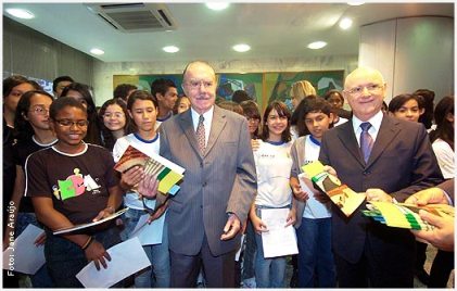 Cerca de 40 crianças, alunos do Centro de Ensino Fundamental Quatro da Ceilândia, receberam do presidente José Sarney e do presidente do Superior Tribunal de Justiça (STJ) e do Conselho da Justiça Federal (CJF), ministro Ari Pargendler, exemplares da Constituição Federal em cerimônia para celebrar os 10 anos dos projetos educativos do STJ e do Senado. Os estudantes cantaram, em coro, o hino nacional cuja letra está impressa nas faces internas da capa do exemplar da Constituição, ao final da celebração. Na face interna da contra capa está impresso o hino da bandeira. Sarney mostrou-se emocionado e disse aos estudantes que saber a letra do hino nacional é uma demonstração de ser brasileiro, pois o hino é um símbolo da identidade nacional. Sarney observou que a letra do hino brasileiro é ecológica, descreve o país, e somente no final a lembra que devemos estar prontos para defendê-lo, em caso de ameaça. O senador e o ministro Ari Pargendler destacaram que a Constituição é um pacto da sociedade necessário para a convivência social e ao desenvolvimento do País.
