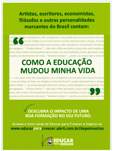 Recebi este email do Educar para Crescer e não poderia deixar de participar dessa luta pela educação. Vale à pena acessar e ler os diversos depoimentos daqueles que venceram através da educação.