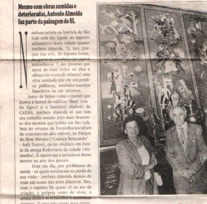 Acompanho seu blog e hoje trago uma denúncia: meu avô, Antônio Almeida, um ícone da arte maranhense, também o primeiro e único artista plástico membro de uma academia maranhense de letras, faleceu há dois anos, e muitas obras deles estão abandonados pelo governo do estado, sendo uma das principais, o painel em azulejo do antigo banco do estado do maranhão, o BEM, outras foram descaracterizadas, outras simplesmente desapareceram… São inúmeras. Ele faria aniversário no dia 27 de maio e a família está junto aos meios de comunicação, organizando um manifesto através de jornais, mas nada temos ainda na internet.
