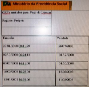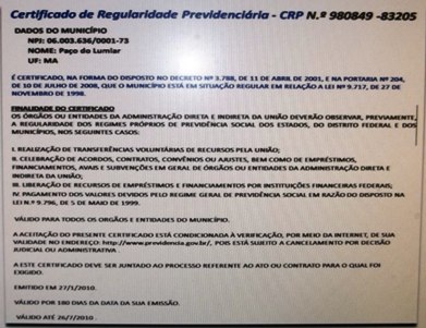 Em 2010, com estas informações falsas da prefeita, foi obtido indevidamente o documento CRP – Certificado de Regularidade Previdenciária, emitido em 27.01.2010 com validade até 27/07/2010 (Itens 7.1 e 7.2 do Relatório).