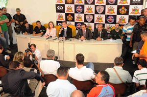 A governadora Roseana Sarney acaba de conceder uma coletiva, no Palácio dos Leões, para divulgar a prisão do assassino e dos mandantes do jornalista Décio Sá. Ela estava acompanhada do Vice-governador Washington Oliveira, do Chefe da Casa Civil, Luis Fernando, dos Secretários Aluísio Mendes, João Alberto, Hildo Rocha, Sérgio Macedo, José Antonio Heluy, Coronel Vieira, Comandante da PM, Cel. Franklin, do secretário adjunto de segurança, delegado Laércio e da Delegada Geral, Cristina Menezes.