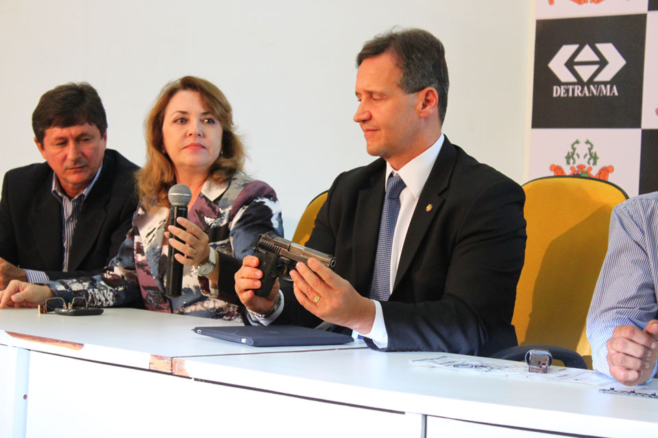 Em coletiva agora pouco, no auditório da Secretaria de Segurança Pública, o secretário Aluísio Mendes apresentou a pistola ponto 40 que foi usada para assassinar o jornalista Décio Sá, no dia 23 de abril, no bar Estrela no Mar, na Avenida Litorânea.