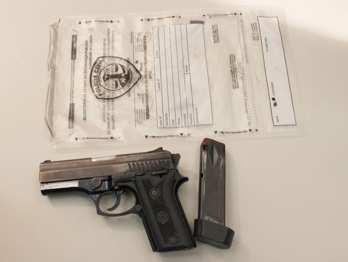 Segundo as primeiras perícias, a arma está com o brasão raspado, mas ou é do acervo da Polícia Militar ou Civil do Maranhão.