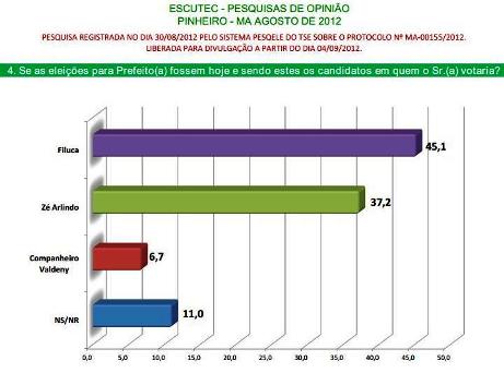 Filuca aparece com 45,1 % dos votos, enquanto seu adversário, Zé Arlindo aparece com 37,2%, uma diferença de 7,9%.