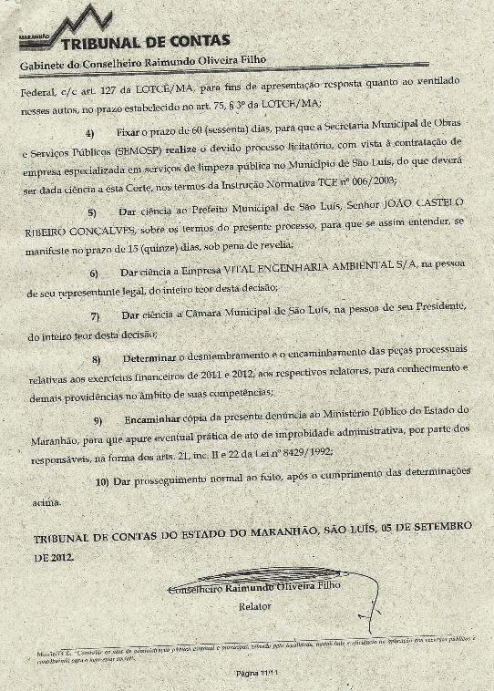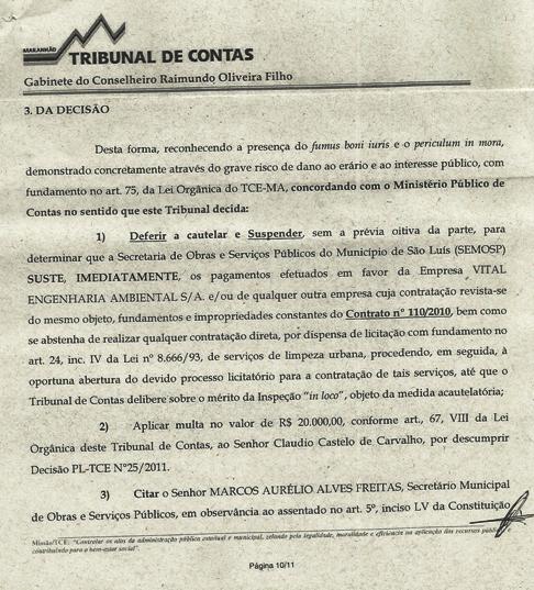 O TCE – Tribunal de Contas do Estado do Maranhão acolheu, hoje (05), por unanimidade, o parecer do Ministério Público de Contas, na Decisão PL-TCE nº 25/2011 – fls. 702/703, pelos descumprimentos da Secretaria de Obras e Serviços Públicos do Município de São Luís, no que tange o contrato emergencial firmado entre a SEMOSP e a empresa Vital Engenharia Ambiental S/A, para execução dos serviços de limpeza urbana nas áreas A e D do município de São Luís, através dos contratos nº 10/2010 de 25/03/2010, no valor de R$ 13.780.025,28 e um termo aditivo nº 01/2010 de 25/03/2010 de acréscimo ao referido contrato no valor de R$ 2.472.700,78, passando, portanto, para o total de R$ 16.252.726,06 e outro contrato nº 110/220/2010 de 22/09/2010 com o mesmo valor do anterior de R$ 13.780.025,28 e um termo aditivo n 001/2011 de acréscimo ao referido contrato de R$ 3.298.716,97, passando, portanto, para o total de R$ 17.078746,25, perfazendo o total dos dois contratos e seus respectivos aditivos de R$ 33.331.472,31, ambos sem edital e o Processo licitatório.