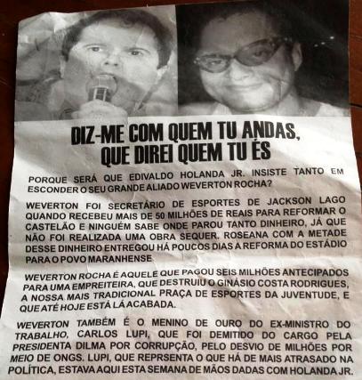Portanto, caso o segundo turno seja entre Castelo e Holandinha, vai acontecer tal como em 2008, quando o grupo da governadora havia dividiu, uns ficaram com Castelo e outros com Flávio Dino, isso sem enfatizar o apoio… Quanto a subir no palanque? Esqueçam isso!!!
