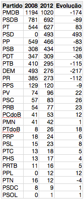 Enquanto PSB e PSD estão em ascensão, outros cinco partidos médios – com votação entre 3,7 milhões e 6,2 milhões, lutam contra o declínio e perderem prefeituras em relação a 2008: PP, PDT, PTB, DEM e PR. O DEM teve os resultados mais negativos. Conquistou 276 prefeituras. Nas eleições passadas, tinham sido 493. Em 2004, 784.