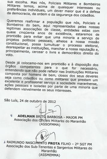 Para eles, trata-se de crime militar e que deve ser apurado, dando o direito de ampla defesa. Eles disseram que essa ação foi praticada pela minoria da corporação, que é irresponsável, e que a maioria absoluta é totalmente contra essa prática política, visto que o policial militar entra para a corporação sabendo que ele não pode participar ativamente de atos políticos, mas que tem todo o direito de escolher democraticamente seu candidato.