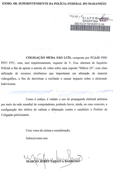 A coligação Muda São Luís protocolou na Polícia Federal que investigue a manipulação do vídeo intitulado de “Milícia36”.