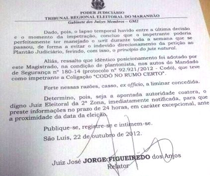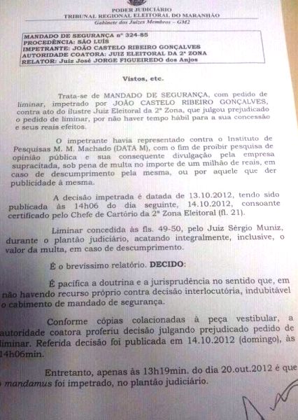 Para completar a vitória de Flávio Dino, o juiz eleitoral José Jorge Figueiredo dos Anjos, cassou, liminar que proibia a divulgação da pesquisa da DataM. Com certeza a multa de R$ 53 mil também foi pro espaço. (decisão abaixo).