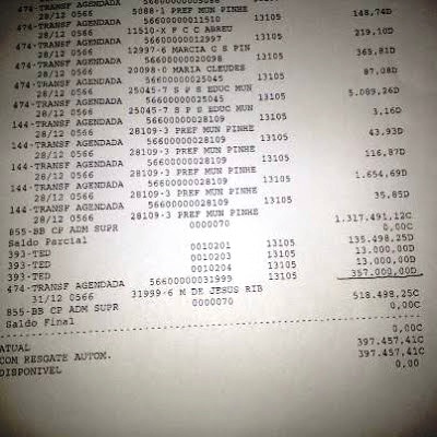Segundo apurou Vandoval, No ultimo dia 02 a Empresa M. de Jesus Ribeiro (Gráfica Santo Inácio), recebeu em R$ 357.000,00 (trezentos e cinqüenta se sete mil reais). A transferência agendada dia 31/12/2012 dia do ultimo dia de mandato do ex-prefeito Zé Arlindo, extrato abaixo.