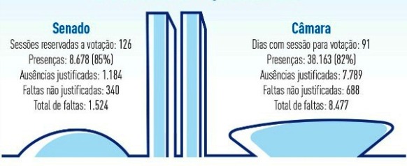 Faltas caíram no Senado, mas cresceram na Câmara. No total, mais de mil ausências ficaram sem justificativa nas duas Casas