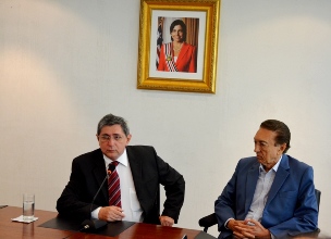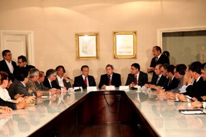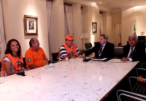 O governador em exercício, Washington Luiz Oliveira, se reuniu com integrantes do movimento Força Sindical, no fim da tarde desta quinta-feira (21), no Palácio dos Leões. O encontro foi para tratar sobre a manutenção da Refinaria Premium I em Bacabeira (MA), cuja construção até 2017 foi garantida pelo ministro de Minas e Energia, Edison Lobão. Presentes, o presidente da Força Sindical do Maranhão, Frazão Oliveira; o diretor do Sindicato dos Metalúrgicos de São Paulo e da Força Sindical Nacional, Edison Passos; e a diretora da Força Sindical do Maranhão, Iandecy Regadas. O deputado federal Sétimo Waquim também participou da reunião.