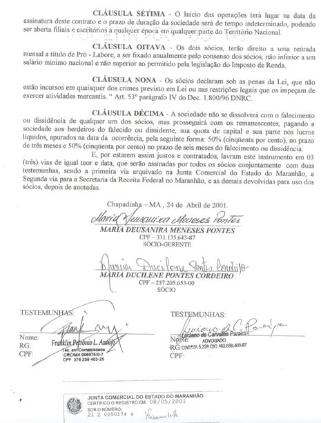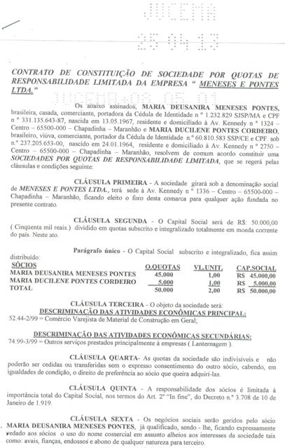Abaixo, segue a documentação que comprovam que a citada empresa que efetuou a compra do veículo é de propriedade da atual prefeita de Chapadinha.