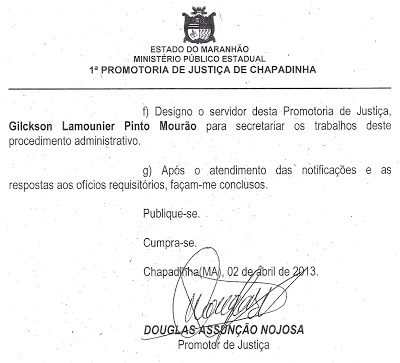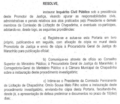 Ainda no despacho que instaurou o Inquérito Civil Público o promotor Douglas Nojosa determinou a fixação da portaria no mural do prédio da promotoria, envio de cópia da portaria e documentos para a Procuradoria Geral de Justiça do Estado do Maranhão, para a Câmara Municipal de Chapadinha e determinou a intimação do servidor Ornilo Sousa Melo Filho, presidente da Comissão Permanente de Licitação de Chapadinha.