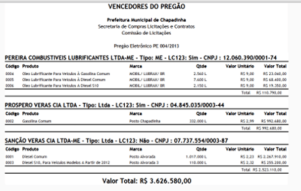 As empresas sortudas que venceram o certame foram a Pereira Combustíveis Lubrificantes LTDA com R$ 110.790,00, Próspero Veras Cia LTDA no valor de R$ 992.680,00 e Sanção Veras Cia LTDA num total de R$ 2.523.110,00.
