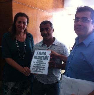 Uma petição com 50 mil assinaturas em favor da saída do presidente da Confederação Brasileira de Futebol (CBF), José Maria Marin, foi protocolada nesta segunda-feira (1º), na sede da entidade, no Rio de Janeiro. O documento foi entregue pelos deputados Romário (PSB-RJ) e Jandira Feghali (PCdoB-RJ), acompanhados de Ivo Herzog, filho do jornalista Vladimir Herzog, morto pela ditadura aos 38 anos. Romário, principal desafeto de Marin no Congresso, quer que o cartola seja investigado, entre outras suspeitas, por eventual participação na morte de Herzog, em 25 de outubro de 1975, quando o então diretor de Jornalismo da TV Cultura estava em poder de órgãos de repressão em São Paulo.