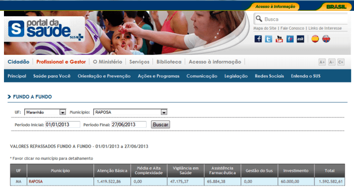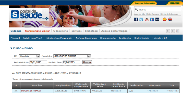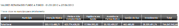 Muitos não sabem que aí não estão os 15% que os prefeitos devem aplicar na saúde pública de toda sua receita. Os valores constantes abaixo são apenas os repasses fundo a fundo feitos pelo Ministério da Saúde.