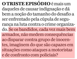 “Eu estava sentada na frente e aí o ônibus parou no sinal e eu vi aqueles dois homens saindo do carro, puxando aquela arma grandona e atirando que nem uns loucos”, afirmou. “Foi muito tiro. Muito, muito, mas muito tiro. Eu não sei que mundo é esse. Eu agradeço a Deus pela minha vida.”