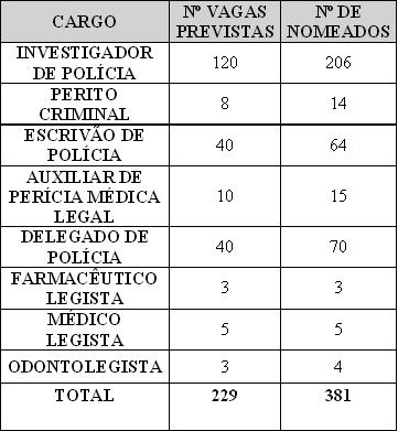 No último dia 10, teve início o processo de nomeação dos candidatos classificados no concurso da Polícia Civil para os cargos de Auxiliar de Perícia Médico Legal, Escrivão de Polícia, Farmacêutico Legista, Investigador de Polícia, Médico Legista, Odontolegista e Perito Criminal. Ao todo, estão sendo nomeados 381 candidatos, o que representa um aumento, em média, de 60% a mais do número de vagas previstas no edital, que era de 229. O acréscimo no efetivo geral de profissionais na Polícia Judiciária chega a mais de 20%. Para o cargo de Delegado de Polícia Civil estão previstas 40 novos vagas. A previsão da Secretaria de Estado de gestão e previdência (Segep) é de que sejam nomeados mais 30 excedentes. Só para esta categoria o aumento será de 75%.