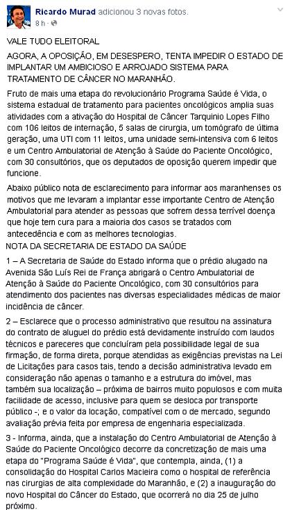 Por outro lado, Flávio Dino, você faz de tudo para comprometer o bem-estar da coletividade, haja vista que suas ações vão de encontro aos anseios daqueles que necessitam de assistência em tratamento do câncer… Respeite o próximo!!!