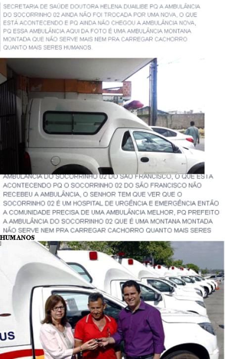 Ele lamenta o descaso e diz que a cidade dispõe de poucas ambulâncias para atender a grande da população dos bairros. “Temos, novamente, esse monte de ambulância quebrada no pátio ali atrás da prefeitura, pois anteriormente foi uma briga minha e a secretária determinou a reforma das mesmas que beneficiou a nossa população”, frisa.