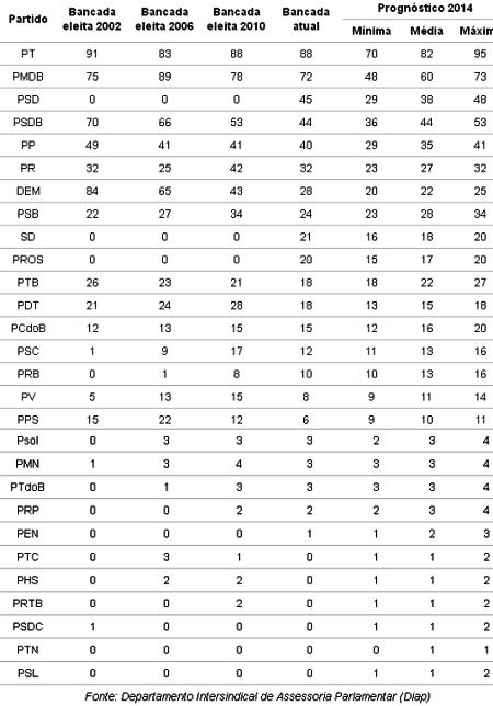 Segundo o prognóstico do Diap, apesar de menores, o PT e o PMDB continuarão, respectivamente, como primeira e segunda maiores bancadas. O PSDB continuará em terceiro lugar e o PSD e o PP disputam a quinta posição. O PR e o PSB disputam a sexta posição, seguidos do DEM, do PTB, do Pros, do SD, do PDT e do PCdoB.