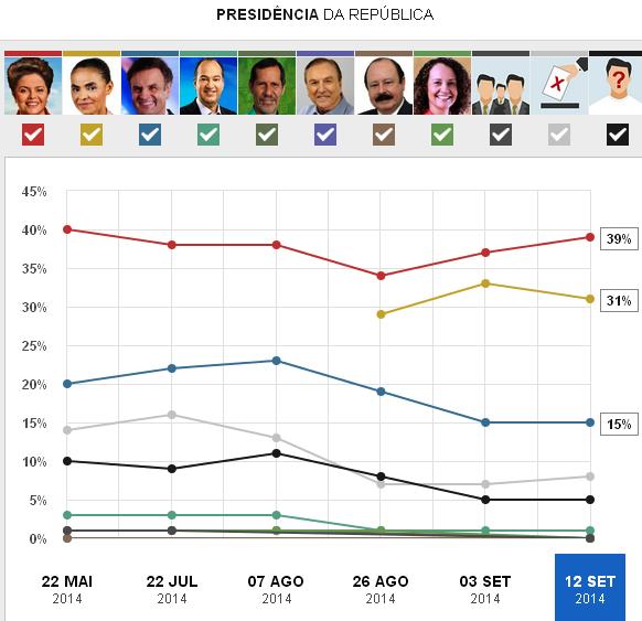 Pesquisa Ibope divulgada nesta sexta-feira (12) mostra que a presidente Dilma Rousseff (PT), candidata à reeleição, tem 39% das intenções de voto, numericamente à frente de Marina Silva (PSB), com 31%, na disputa pela Presidência da República. Como a margem de erro é de dois pontos percentuais para mais ou para menos, não há mais situação de empate técnico entre as candidatas na simulação de primeiro turno, ao contrário do que acontecia na pesquisa anterior do instituto, divulgada no último dia 3. Naquele levantamento, o Ibope apontou que Dilma liderava com 37%, contra 33% de Marina.