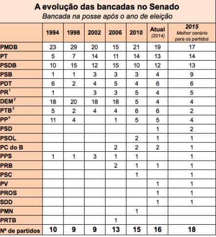 Em 2002, primeiro ano do governo Lula, o Senado tinha nove legendas representadas na Casa, metade da projetada para 2015. Atualmente, há senadores de 16 partidos diferentes.