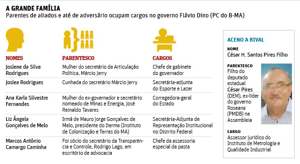 Outro parente nomeado, o advogado César Pires Filho, assessor jurídico do Instituto de Metrologia e Qualidade Industrial do Maranhão, tem sangue oposicionista. Seu pai, o deputado estadual César Pires (DEM), foi líder do governo Roseana na Assembleia.