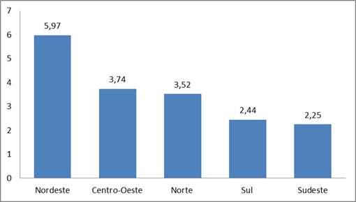 De acordo com os dados, a Região Nordeste apresenta a maior incidência de violência letal contra adolescentes, com um índice igual a 5,97. Em contrapartida, o Sudeste possui o menor valor, com uma perda de 2,25 jovens em cada mil. Foi verificada ainda uma redução na mortalidade na Região Sul.