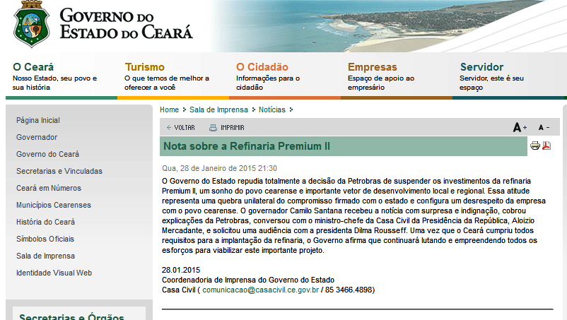 As indústrias do estado também não escondem a frustração. “Eu acho que essa situação que nós estamos vivendo no Ceará, com a desistência da Petrobras em construir esse grande monumento industrial é uma grande decepção”, afirma O presidente da Federação das Indústrias do Ceará, Beto Studart.