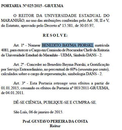 Veja só: No Diário do Dia 16/01 consta a nomeação do Senhor de Benedito Bayma Piorki que é Procurador do Estado aposentado para o cargo de Procurador Chefe da Reitoria da UEMA.