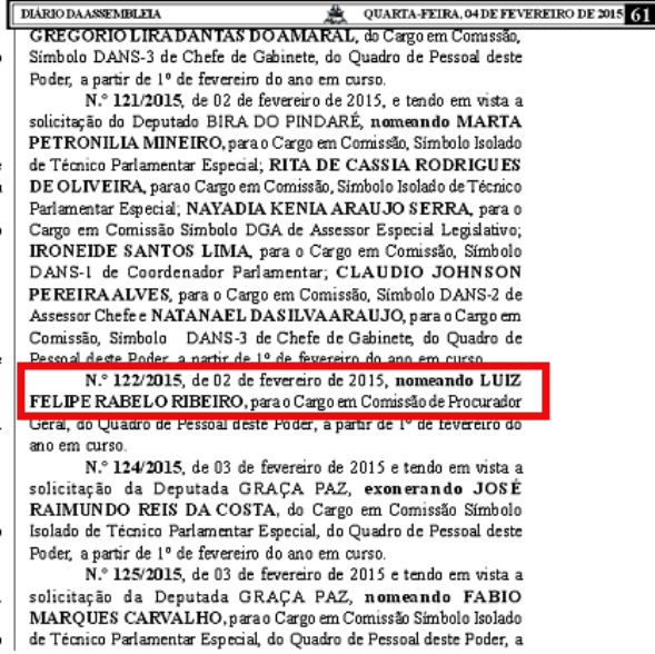 O interessante é que no mesmo dia 04 de fevereiro de 2015, o Sr. Luiz Felipe Rabelo Ribeiro, aparece no Diário Oficial do Estado, sendo nomeado na Secretária de Saúde do Estado, para o cargo Assessor Sênior da Assessoria de Planejamento e Ações.