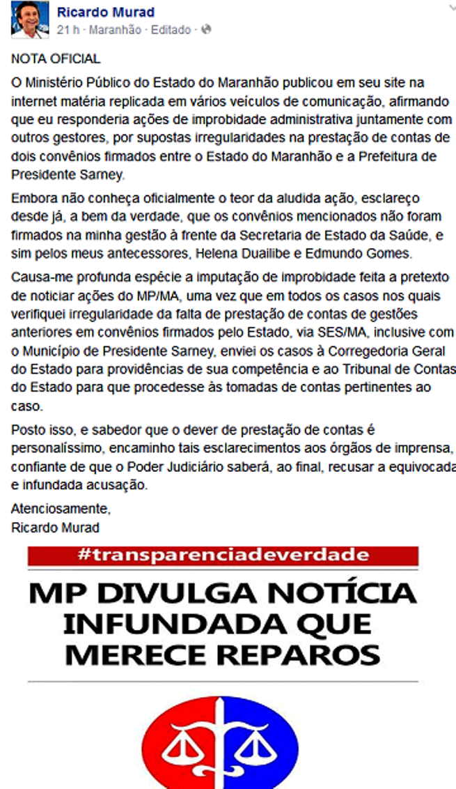 Em sua Nota, o ex-secretário Ricardo Murad afirma que o MPMA se equivoca ao incluir seu nome no tocante a improbidade administrativa quanto aos convênios firmados entre o governo do Estado e municípios, cujas assinaturas foram efetuadas nas gestões de Edmundo e Helena Duailibe.