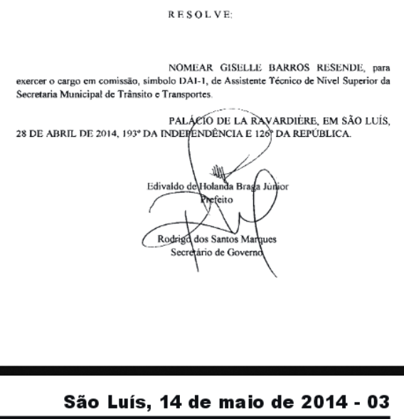 Pois nomeou sem pestanejar para a SMTT sua própria sobrinha, a Giselle Barros Resende, conforme consta do Diário do 14/05/2014.