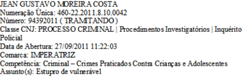O superintendente JEAN GUSTAVO MOREIRA COSTA responde por ESTUPRO DE VULNERÁVEL Em imperatriz processo 94392011.
