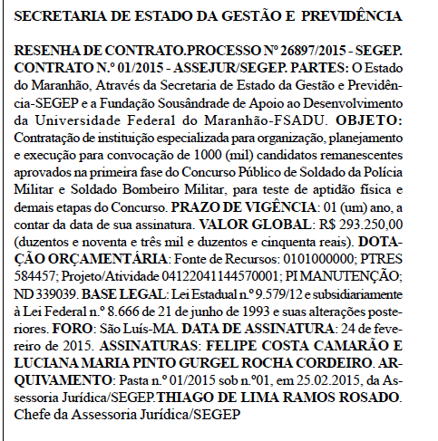 No Diário Oficial do dia 02 entre uma cambada de aditivo de contratos municipais e até um da SEJAP, eu disse da SEJAP que havia prometido mudanças, aparece a contratação da Sousândrade para dar seguimento a etapa de aptidão física aos remanescentes do concurso para Polícia Militar e Corpo de Bombeiros Militar.
