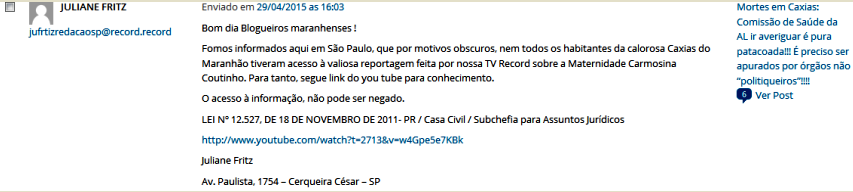 Fomos informados aqui em São Paulo, que por motivos obscuros, nem todos os habitantes da calorosa Caxias do Maranhão tiveram acesso à valiosa reportagem feita por nossa TV Record sobre a Maternidade Carmosina Coutinho. Para tanto, segue link do you tube para conhecimento.