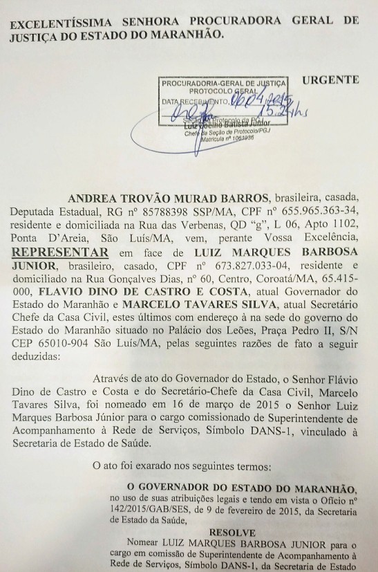 A deputada estadual Andrea Murad (PMDB) protocolou uma representação na Procuradoria Geral de Justiça contra o governador Flávio Dino e o chefe da Casa Civil, Marcelo Tavares. A deputada pede à PGJ que apure a conduta qualificada como improbidade administrativa praticada por Flávio Dino e Marcelo Tavares, referindo-se à nomeação de Luiz Júnior, hoje exercendo o cargo de Superintendente de Acompanhamento à Rede de Serviços da Secretaria de Estado da Saúde. Um dos fatos da representação, trata-se do ato de nomeação ocorrido em 16 de março. Ele já vinha exercendo o cargo de chefe da rede desde o início de janeiro conforme a própria publicação no diário oficial o nomeando com efeitos retroativos a 1º de janeiro. Ou seja, Luiz Marques Barbosa Júnior esteve exercendo o cargo de