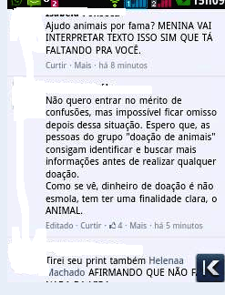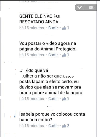 Segundo os relatores, a administradora postou na página dele a foto do cão e pediu dinheiro antecipado para o resgate e recebeu a doação. “Ai alguém passou e descobriu que o cão não tinha sido resgatado. Ai começou a confusão para a Isabela (administradora) dizer o porquê do não resgate do cão, já que ela tava com dinheiro de doação”, afirmaram.