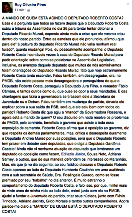 Suas atitudes são de quem está apoiando o desgoverno Flávio Dino para conseguir o seu apoio quando for disputar a Prefeitura de Bacabal. Mas será que ele vai mesmo sair candidato à Prefeitura de Bacabal? Como ficaria sua coligação? A cúpula do PMDB aceitará isso?