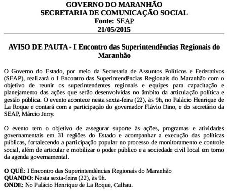Após informar, pouco após o meio dia, que o governo realizaria o Encontro das Superintendências Regionais do Maranhão no Palácio Henrique de La Roque, lá pelas 16h, a Secom corrige e informa, grafado em vermelho (a cor do PC do B), que o encontro vai ser é no Palácio dos Leões. Isto no título e no final do comunicado porque no meio do aviso continua constando que o encontro vai ser no La Roque.
