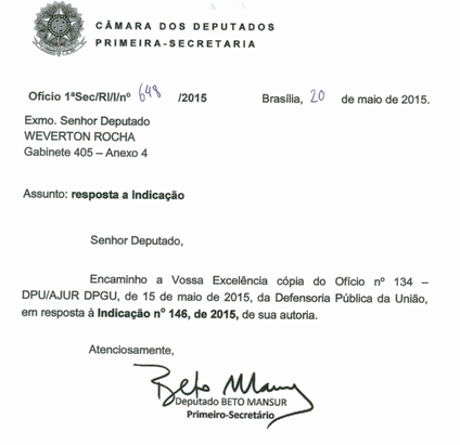 investimentos e contraíram dívidas para expandir seus negócios no sentido de atender as demandas decorrentes da construção da refinaria Premium I. De acordo com Weverton Rocha, a solicitação propõe ação civil pública em favor da população do município de Bacabeira/MA. A DPU acatou o pedido, delegando ao Defensor Público Federal, no âmbito da unidade de Defensoria Pública da União em São Luís/MA, a tarefa de auxiliar os moradores afetados com o cancelamento do empreendimento. “Isso mostra que todo o meu esforço não foi em vão. Continuarei atuando para que a população de Bacabeira não fique desamparada”, disse. O prefeito de Bacabeira, Alan Linhares, recebeu com muita alegria a notícia de que um órgão federal atuará na defesa dos direitos de pequenos empresários e de pessoas naturais do município. ”É uma esperança que dará um novo encaminhamento para o caso da refinaria. Contamos, desde sempre, com o importante trabalho do deputado Weverton Rocha nesta causa, que se tornou bandeira de luta de todos”, ressaltou. A DPU abriu, no início deste mês, o procedimento de assistência jurídica PAJ 2015/012-1089. O documento foi distribuído ao Ofício de Direitos Humanos e Tutela Coletiva, com o título: “DEFESA DOS DIREITOS INDIVIDUAIS HOMOGÊNEOS DE PEQUENOS EMPRESÁRIOS E DE PESSOAS NATURAIS DE BACABEIRA-MA”.