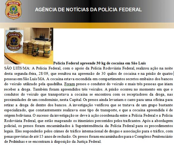 Polícia Federal apreende 30 quilos de cocaína em São Luís
