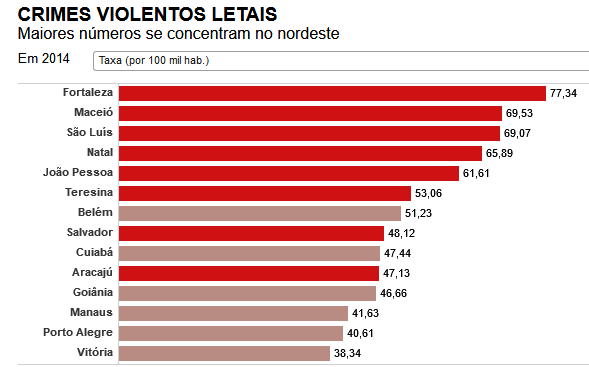 Fortaleza lidera, seguida por Maceió, São Luís e Natal, deixando, com isso, a Região Nordeste como a mais violenta entre todas, cujos resultados demonstram aumento assustador da criminalidade.