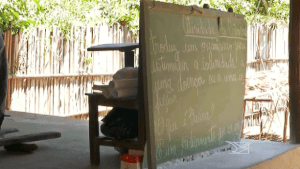 Todos os dias crianças se reúnem em carteiras de madeira, embaixo de uma cobertura de palha, para estudar sem material escolar.