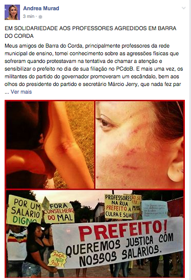 Meus amigos de Barra do Corda, principalmente professores da rede municipal de ensino, tomei conhecimento sobre as agressões físicas que sofreram quando protestavam na tentativa de chamar a atenção e sensibilizar o prefeito no dia de sua filiação no PCdoB. E mais uma vez, os militantes do partido do governador promoveram um escândalo, bem aos olhos do presidente do partido e secretário Márcio Jerry, que nada fez para impedir esses crimes, que além das agressões, contra o direito a liberdade de expressão.