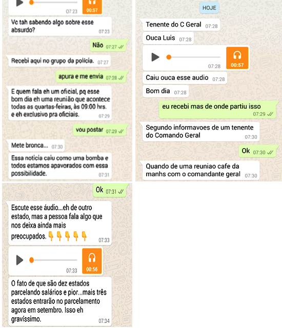 Após uma conversa, via WhatsApp, com militares, conforme foto acima, eles garantiram que hoje (17), num tradicional reunião que acontece todas as quartas-feiras, exclusivamente para oficiais, deixaram claro que haverá um corte de 30% no orçamento da Polícia Militar do Maranhão e que os salários dos policiais militares serão pagos parcelados.