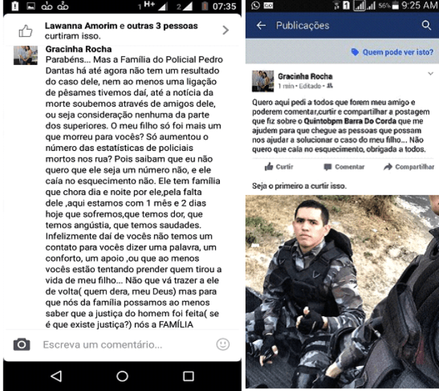 Ela gravou um áudio, onde reclama do Comando da Polícia Militar, que sequer teceu algum sentimento de pesares aos familiares do soldado Dantas e fala que as autoridades policiais deveriam prestar esclarecimentos ou ao menos mantê-la informada sobre o andamento das investigações. “Não quero que ele seja um número e cai no esquecimento”, desabafa a mãe do soldado Dantas.